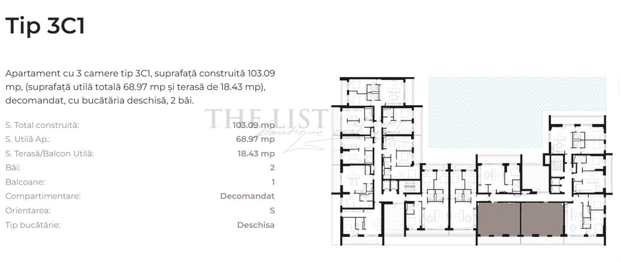 Apartament modern de 3 camere, tip 3C1, situat la etajul 3, cu vedere stradală, într-un complex premium din Pipera. Suprafață utilă 87.40 mp, suprafață construită 103.09 mp, plus terasă de 18.43 mp.