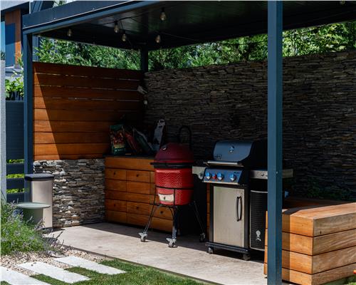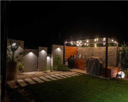Curte amenajata cu gazon, plante decorative si zona de gratar