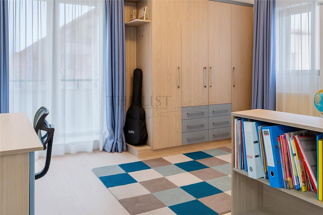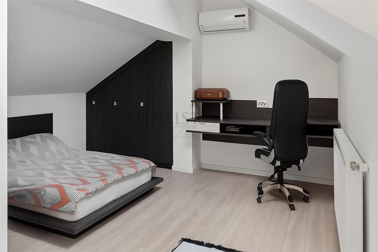 Proprietatea dispune de 6 camere, dintre care 4 dormitoare, living si zona de dining, 4 bai, bucatarie complet mobilata si utilata, 2 balcoane si terasa. Compartimentarea include subsol cu spatii tehnice si de depozitare, parter cu living si acces catre terasa si gradina, etaj cu dormitoare si mansarda cu spatiu multifunctional.
