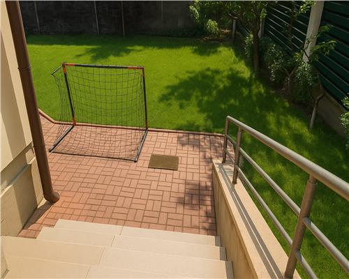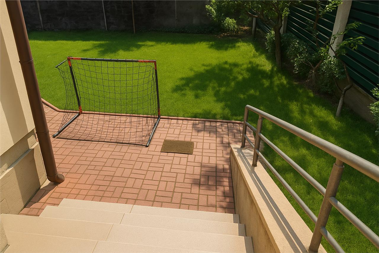 Gradina este amenajata cu vegetatie matura si sistem de irigare, iar curtea permite parcarea mai multor masini, existand si garaj.