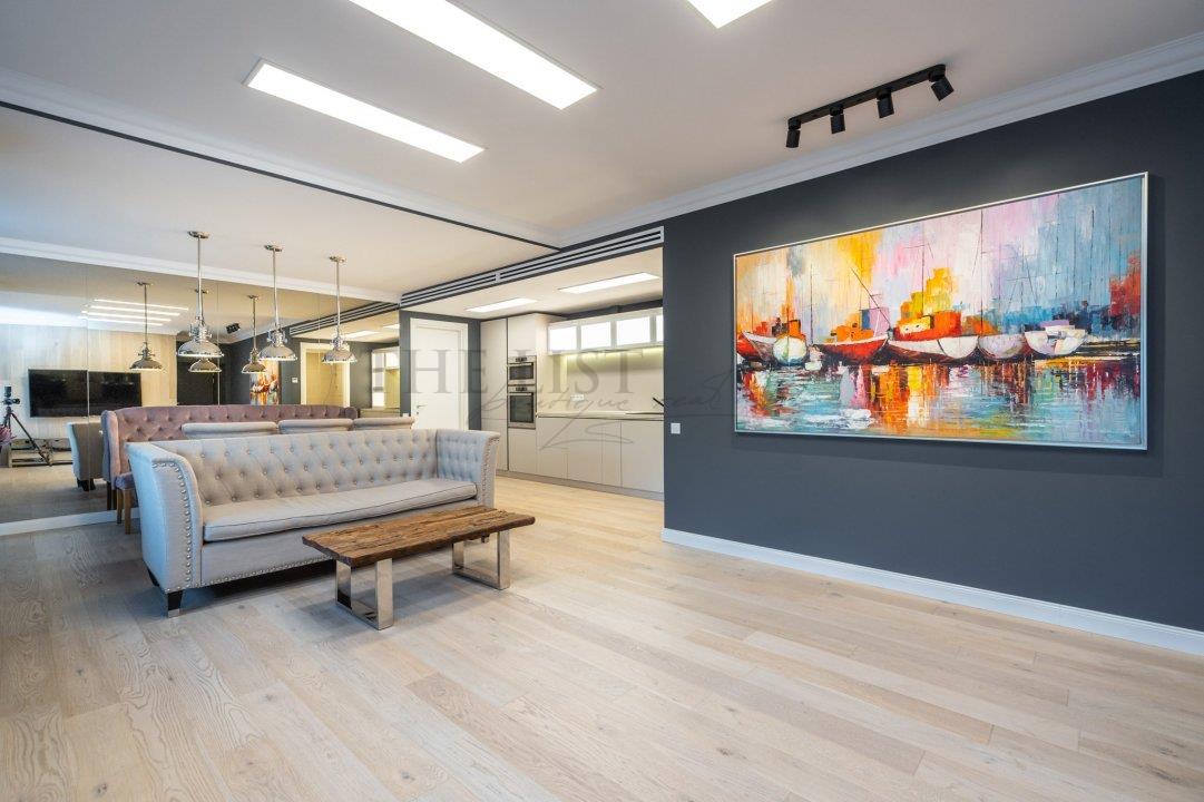 A spacious 50 sqm living room with an open kitchen, providing direct access to the large terrace
