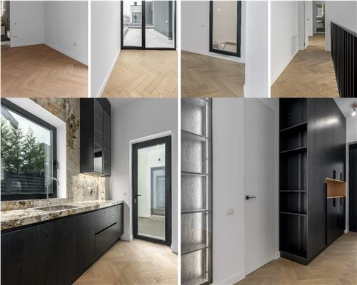 The floors are finished with premium triple-layer oak parquet in Herringbone pattern, offering a refined aesthetic. Marazzi ceramic tiles add elegance throughout, while Glamora vinyl wallpaper (Italy) enhances the interior design. Floor-to-ceiling aluminum windows by Aluprof maximize natural light, and Filomuro Harmony interior doors, flush with the walls, highlight the modern lines of the home.